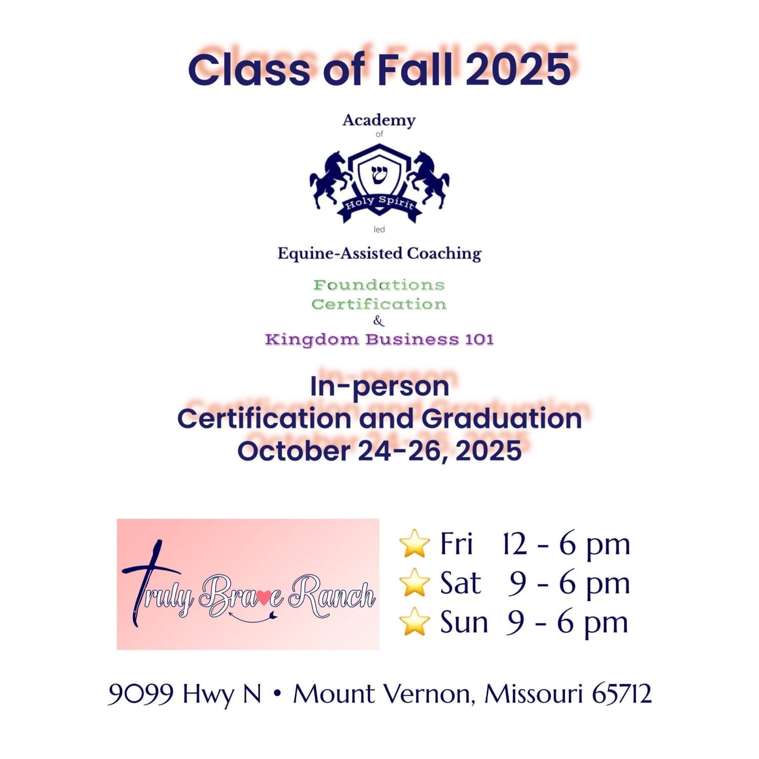 Our next in-person Certification and Graduation is our Fall Class scheduled for October 24 - 26, 2025 at my Ranch - Truly Brave Ranch, Mount Vernon, Missouri.
